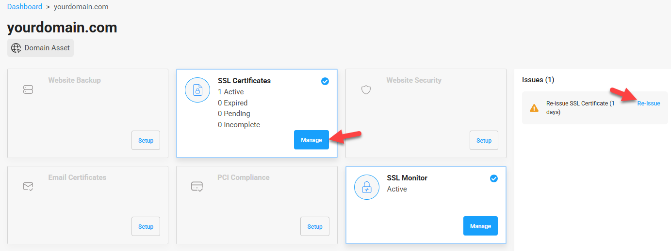 On the details page for your Asset, check for Issues and actions required, or click Manage to check the associated SSL certificates.