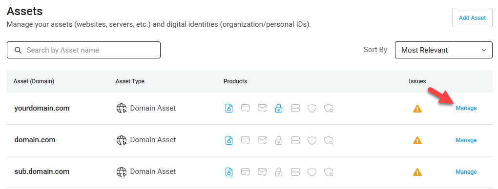 The Assets list can help you find orders by the domain name. Click Manage to view the Asset details page.