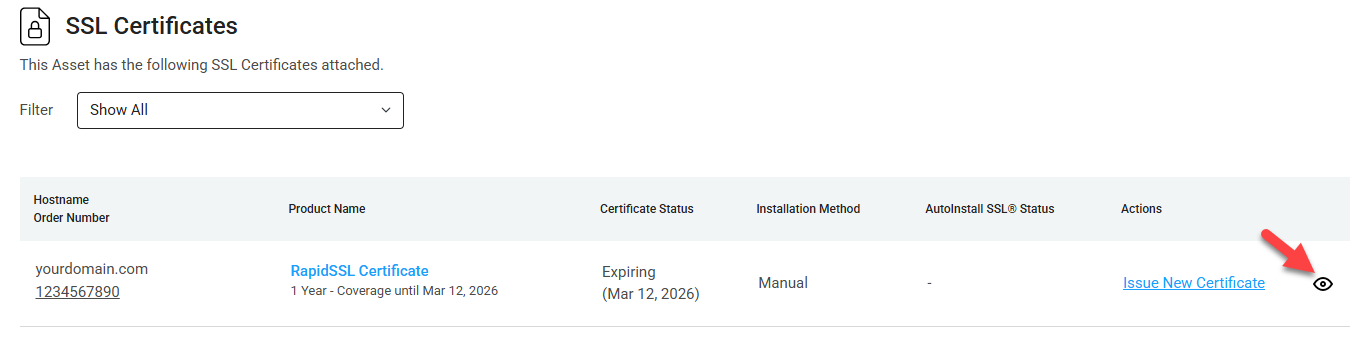 In the SSL certificates list, click the view button to check the full order details. If the certificate is expiring, click "Issue New Certificate" to start the re-issue process.