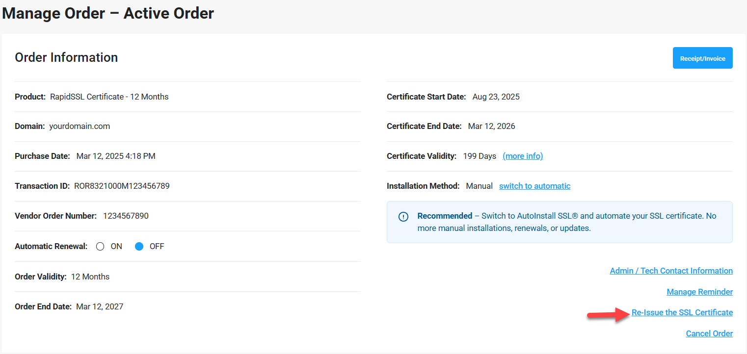 On the Active Order details page, click "Re-Issue the SSL Certificate" to start the re-issue process.