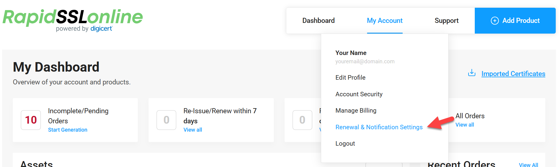 Hover your cursor over My Account on the top-right of the screen, then click Renewal & Notification Settings in the drop-down menu.