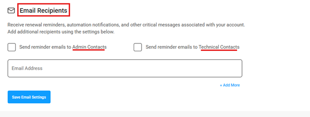 Check "Send reminder emails to Admin/Technical contacts" if you want each certificate's admin or technical contact to receive reminders in addition to your main account email. (Note: admin and technical contact emails are set during certificate enrollment and cannot be changed later).