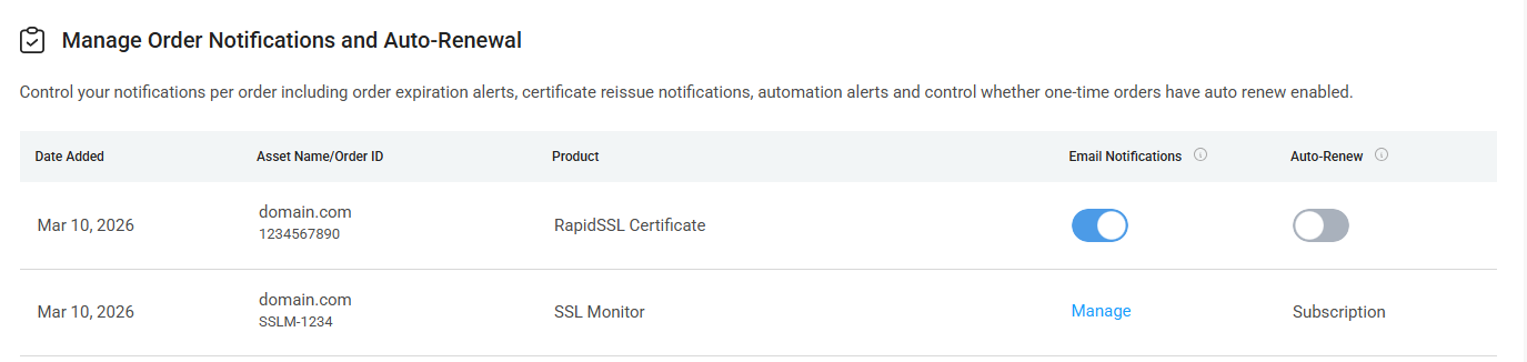 In this section you can toggle reminder settings for individual orders and turn on Automatic Renewal for SSL certificates.