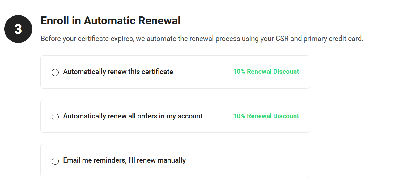 On the enrollment form, Step 3 allows you to turn on Automatic Renewal for this order, or for all of the eligible SSL orders on your account. Select "Email me reminders, I'll renew manually" if you do not want to enable Auto-Renew.