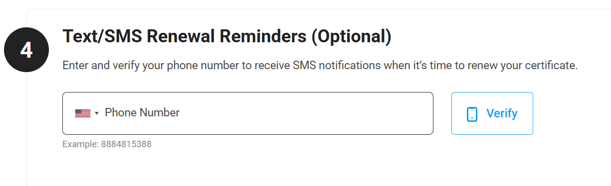 Enrollment Step 4 gives you the option to verify a phone number for text/SMS reminders. You do not need to enter a phone number here to complete enrollment - you can set up text/SMS reminders later on the Renewal & Notification Settings page of your dashboard.